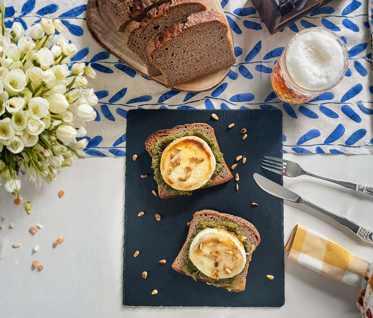 Brotsommelier Kai Oppenborn zeigt mit seiner norddeutsch-südeuropäischen Kombination, wie facettenreich Brotgenuss sein kann. Die Basis bildet ein geröstetes Gersterbrot, das mit seinem kräftigen, leicht rauchigen Aroma perfekt zur würzigen Süße karamellisierten Ziegenkäses passt.