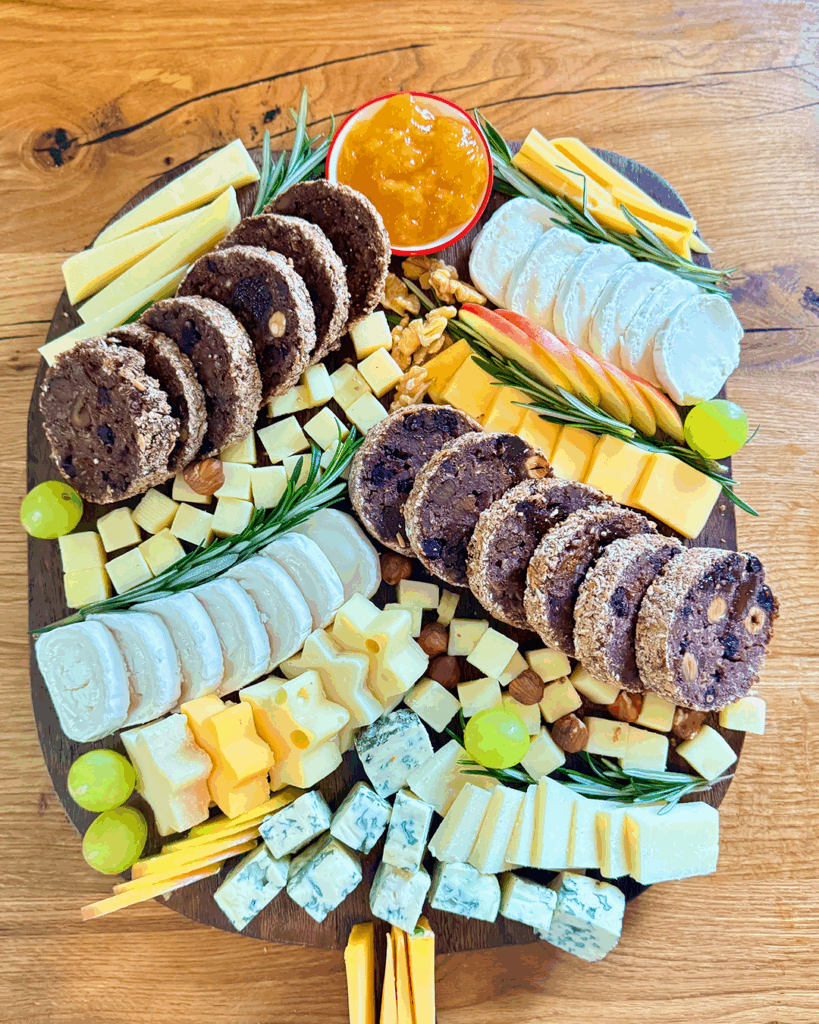 Das kompakte Früchteschwarzbrot, reich an Rosinen und Haselnüssen, liefert eine dichte, leicht süße und nussige Grundlage. Es bietet sich als idealer Kontrapunkt zu den salzigen (Manchego, Blauschimmelkäse) und würzigen (Bergkäse) Noten der Käsesorten an. Die im Brot enthaltenen Rosinen und Haselnüsse harmonieren besonders mit den verschiedenen Fruchtaufstrichen und dem frischen Obst auf der Platte (z. B. Birne zu Gorgonzola, Kirsche zu Manchego). Die Nüsse liefern den notwendigen Crunch, während die cremigen Käsesorten wie Brie und Gorgonzola sanft mit der Brotkrume verschmelzen.